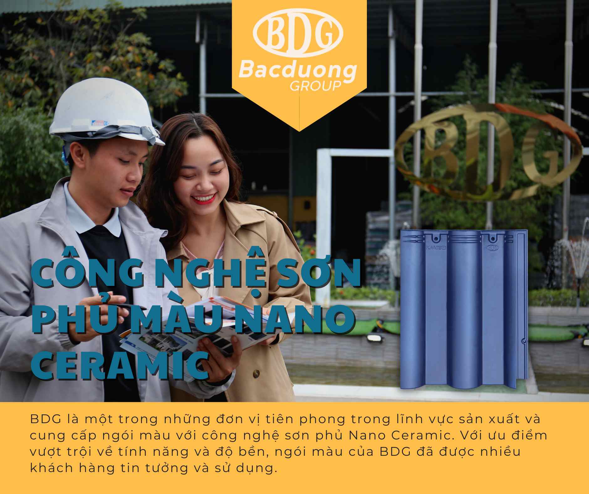 Thông tin về công nghệ sơn phủ Nano Ceramic của BDG BDG sử dụng công nghệ sơn phủ Nano Ceramic trên ngói màu để tạo ra sản phẩm có độ bền cao và khả năng chống thấm nước tốt. Với kết cấu phức tạp của các lớp sợi thủy tinh, nhựa phủ, sợi thủy tinh cường độ cao và lớp sơn chịu lực, ngói màu của BDG có độ bền cực cao và giảm thiểu được tình trạng ố vàng, mốc thấm.